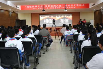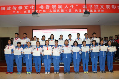 4月23日下午,由东丽区文广局、东丽区图书馆和天津耀华滨海学校共同主办的“阅读传承文化 书香浸润人生”读书征文表彰会在耀华滨海学校图书馆演播厅举行。天津耀华滨海学校初中一年级全体学生、优秀辅导老师、学校领导以及我馆工作人员共同出席表彰会。