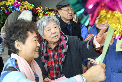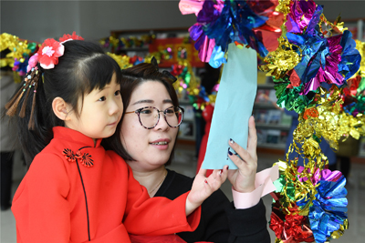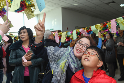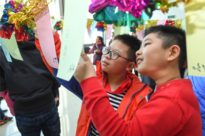 悬挂在阅览室内五颜六色的200条谜面内容照顾到了幼、老、中、青不同的年龄阶段,方便大家对照自己的能力来猜题。猜谜过程中场面既热烈,又秩序井然。这是孩子们尽情展示自己智慧和快乐的时间,活动中,他们有的对着谜语小条认真打量,一旦发现会的就立刻揭下,兴冲冲地去排队兑奖;这也是老年读者挖掘自己知识存储的大好时机,他们带着笔和本,认真地在本子上猜谜底……