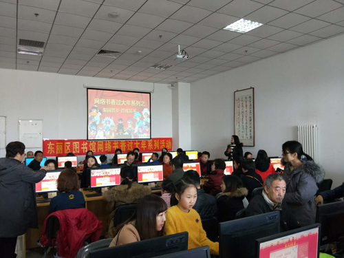 由国家图书馆主办、东丽区图书馆承办的“网络书香过大年”系列活动自1月24日启动以来,已在全区有条不紊地展开。25日上午的活动分为“书香博闻?畅享阅读”在线闯关答题、“经典传情?书福迎春”电子有声贺卡、“九州圆梦?美好生活”在线摄影征集、“书香东丽·好书推荐”电子扫码阅读、“梨园贺岁?百戏昇平”戏曲文化主题展览、“文化年货带回家——世界经典影片欣赏”等数个环节。持续半天的活动让读者真正感受到在“互联网+”的新形势下,数字图书馆给人们带来的海量知识及无穷乐趣,吸引了200余名读者报名参与。