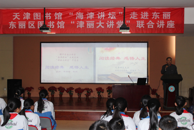 4月24日,东丽区图书馆“津丽大讲堂”联合天津图书馆“海津讲坛”公益讲座下基层活动,在天津耀华滨海学校开讲。