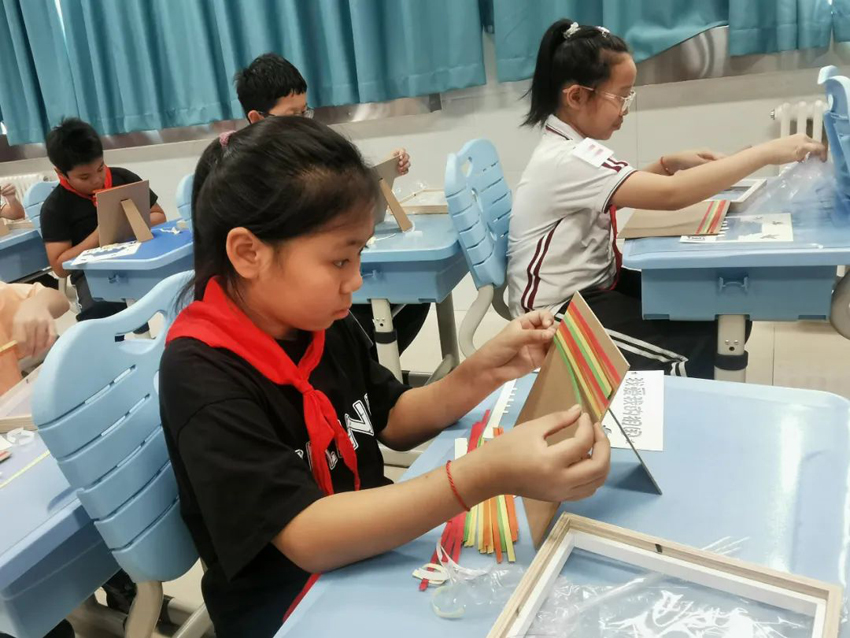 活动中,图书馆老师还与大家展开了互动,为同学们带来了国庆主题竹编画体验环节。一搭一压间,一副副精美的竹编画作品制作完成,同学们带着对祖国的热爱与期许,共迎国庆!