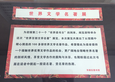 为迎接第二十一个“世界读书日”的到来,图书馆阅览部特举办了“世界百部文学名著展览”,本次展览从馆藏中精心挑选了100多部世界文学名著作品在图书馆二楼展览厅展出。此次书展不但为读者提供了一个接触世界优秀文学作品的机会,更是在读者中掀起了一股读名著、赏名章的热潮。