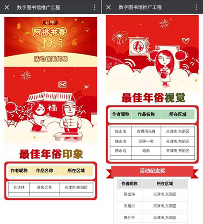 近日,由数字图书馆推广工程联合全国各级公共图书馆开展的“九州同庆·最美年俗”摄影在线有奖征集活动揭晓,东丽区图书馆选送的作品喜获佳绩。区图书馆遴选出14名作者共计68幅作品上报给国家图书馆,最终陈永浩、孙法林2名同志提交的4幅作品获奖,另有3名同志获纪念奖。