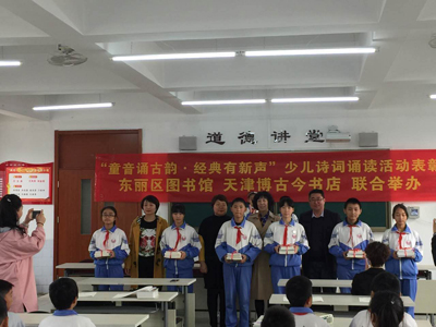 10月24日在大毕庄小学,东丽区图书馆举办了诵读活动表彰会,在对获奖学生进行表彰的同时,为该校赠书240册。