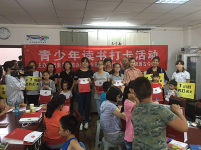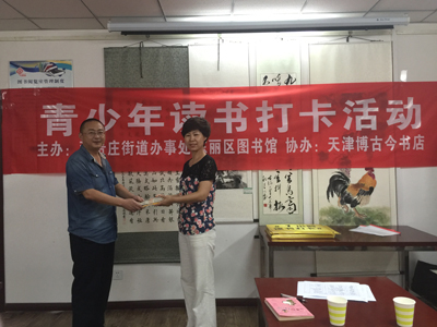 阅读可以开发学生的智力,开阔学生的视野,提高学生的自信心,它是青少年成长中的重要组成部分。一个国家只有孩子爱上阅读,这个国家才会有好的未来。阅读对国家、对个人都有着至关重要的作用,为了激发学生的阅读热情,9月初,张贵庄街道办事处和我馆联合主办,天津市博古今书店协办了张贵庄街青少年“读书打卡”活动。