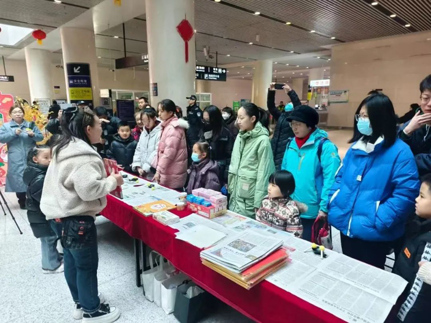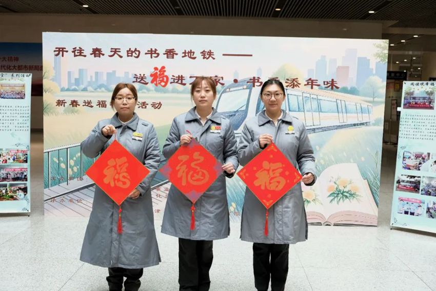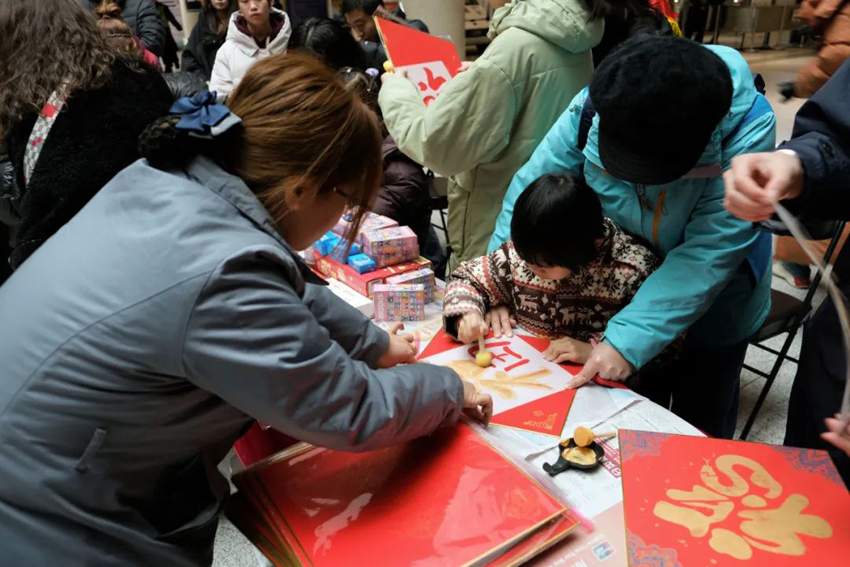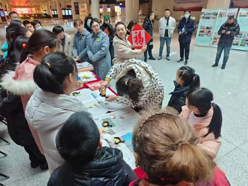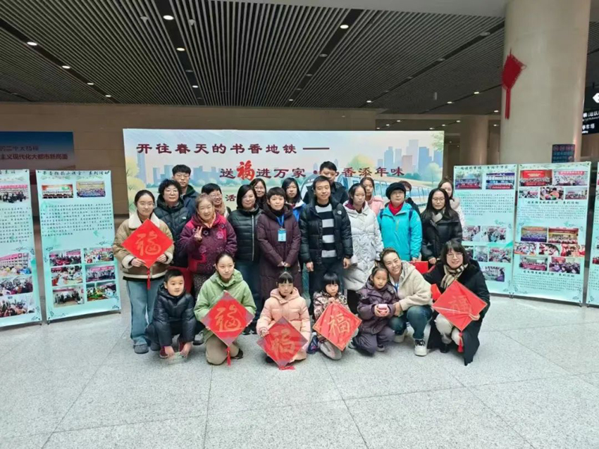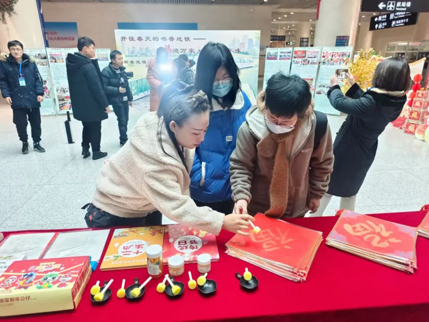 “印福字、接福气”,活动现场热闹非凡,来来往往的乘客们驻足脚步挥毫拓印,体验了一把非遗传统文化的魅力,亲手拓一个“福”字,把“福”带回家,承载着对新春美好的祝福,还为乘客与福字合影、录制新春祝福语,展望新年希冀,记录下这珍贵的瞬间。