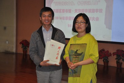 表彰会一开始,高一年级部分学生演出的话剧《平凡的世界》片段将表彰会推向一个小高潮。当165名分获校级、区级、市级征文奖的学生和10位优秀辅导老师上台领奖时,现场气氛热烈,掌声不断。区图书馆和天津博古今书店领导为学校赠送图书140册,我区《群众作家》编辑部赠送刊登有学生优秀征文的期刊120册。
