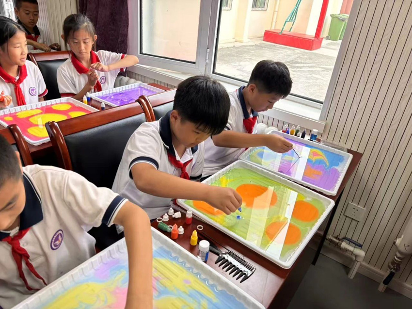 在老师的指导下,学生们以特殊画液为纸、油性颜料为墨,通过滴洒、勾勒等手法,使色彩在水面自由流动形成纹理,再以丝巾或宣纸拓印,将稍纵即逝的水中幻影定格为永恒艺术。现场创作的丝巾作品或如流云飘逸,或似山水氤氲,每幅作品皆为“仅此一件”的孤品,充分诠释了水拓画“水中生花、拓纸成画”的独特美学。一位学生感慨:“当亲手将丝巾浸入画液的瞬间,我仿佛触摸到了盛唐匠人的创作心境,这种跨越千年的文化共鸣让我更懂‘津派文化’的深厚底蕴。