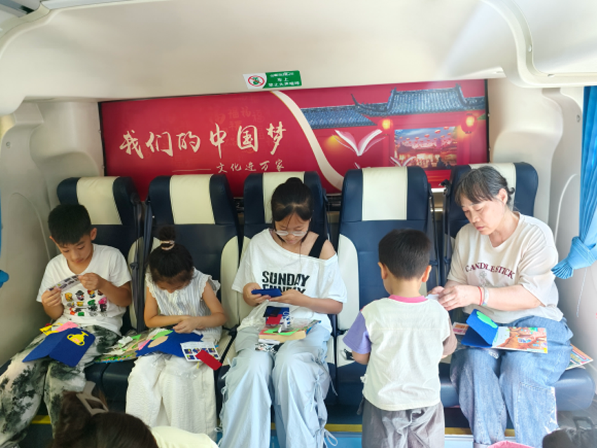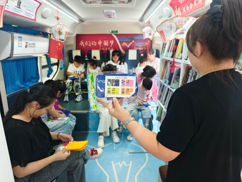 活动进入手工制作环节,在老师的指导下,孩子们用彩布、针线,精心缝制献给父亲的“零钱包”。虽针脚歪斜,却每一针都缝进“谁言寸草心”的赤诚,有的家长俯身帮孩子系紧线结,流动图书车里弥漫着比午后阳光更暖的亲情蜜意。