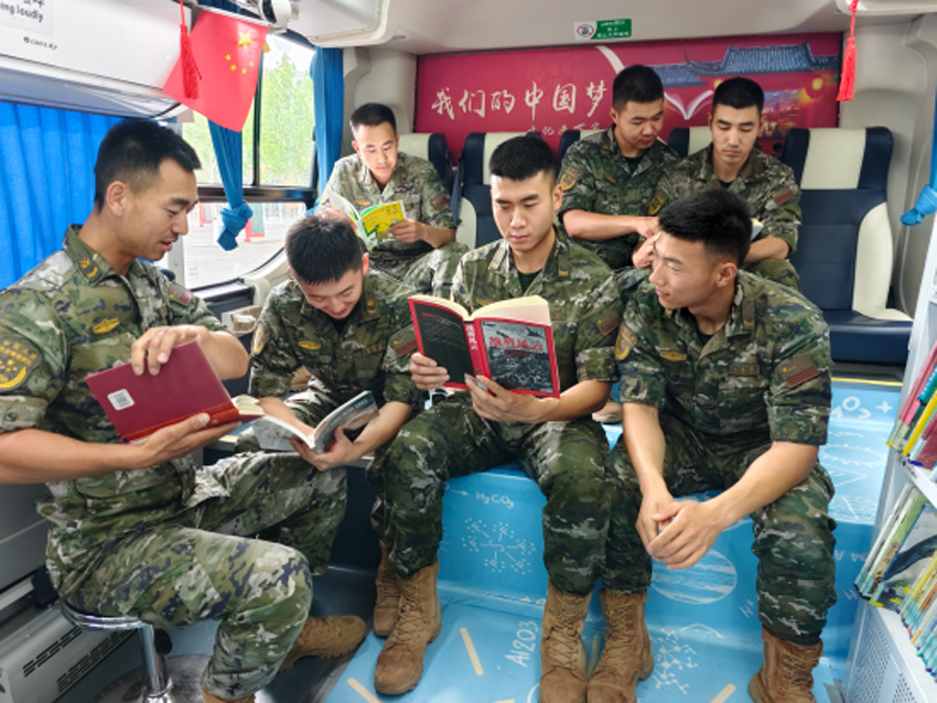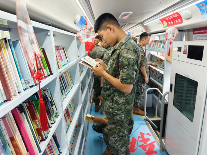 炊事班的战士们也兴致勃勃地上车挑选烹饪书籍,笑着说:“要让战友们吃得更香、练得更强!”这份朴实的心愿,正是军营里最动人的温情。书架上,军事、文学、科技、生活类书籍琳琅满目,战士们或驻足细读,或互相推荐,欢声笑语中,知识的火花在迷彩方阵中跃动。