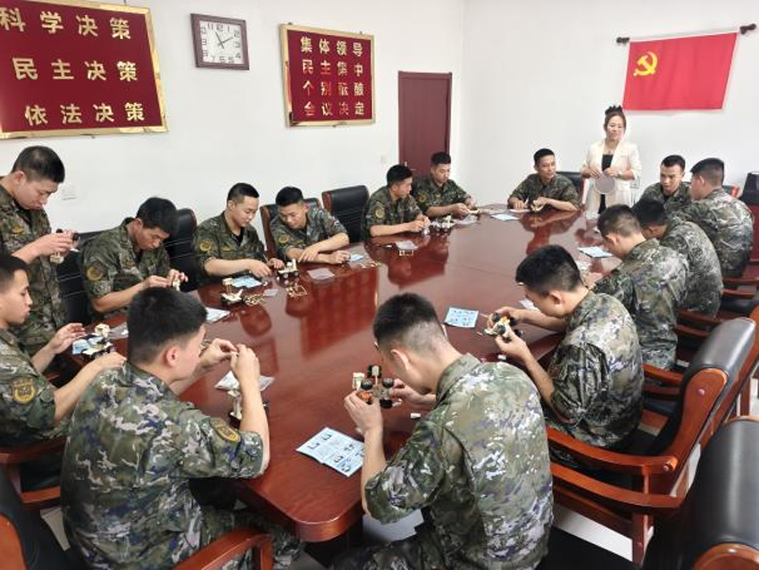 流动服务车里的藏书就让官兵们挪不开眼,军事、科技、文学、历史……等各类图书,而老师向官兵们推荐了人民邮电出版社的《圆梦天宫》,书中记录空间站技术的发展历程与中国载人航天工程的实践成果,通过书籍中详实的技术资料和清晰的逻辑框架,为官兵们展现了中国空间站建设的专业与严谨。随后在科技手工制作环节,官兵们有序分组合作,发挥自己的专长,相互借鉴,完成属于自己的作品。