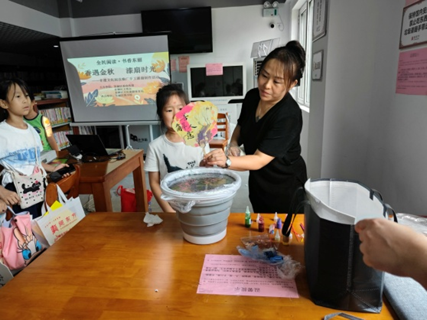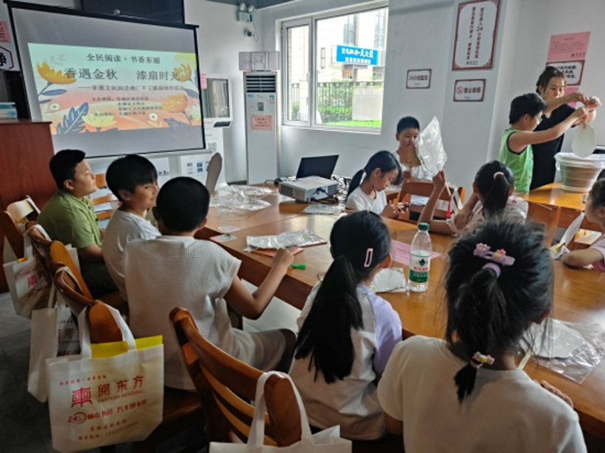传统诗词是中华文化的璀璨明珠,一字一句都凝练着古人对自然、对人生的感悟。为让孩子们在诗词的浸润中领略传统文化的博大精深,体会“诗中有画、画中有诗”的审美境界,让孩子们近距离接触非遗技艺,感受古人“慢工出细活”的匠心,培养对传统文化的热爱与传承意识。2025年8月13日,东丽区“阅东方”城市书房联合金钟街溪水湾第二社区开展全民阅读·书香东丽——“香遇金秋 漆扇时光”传统诗词碰撞非遗文化手工DIY 活动。