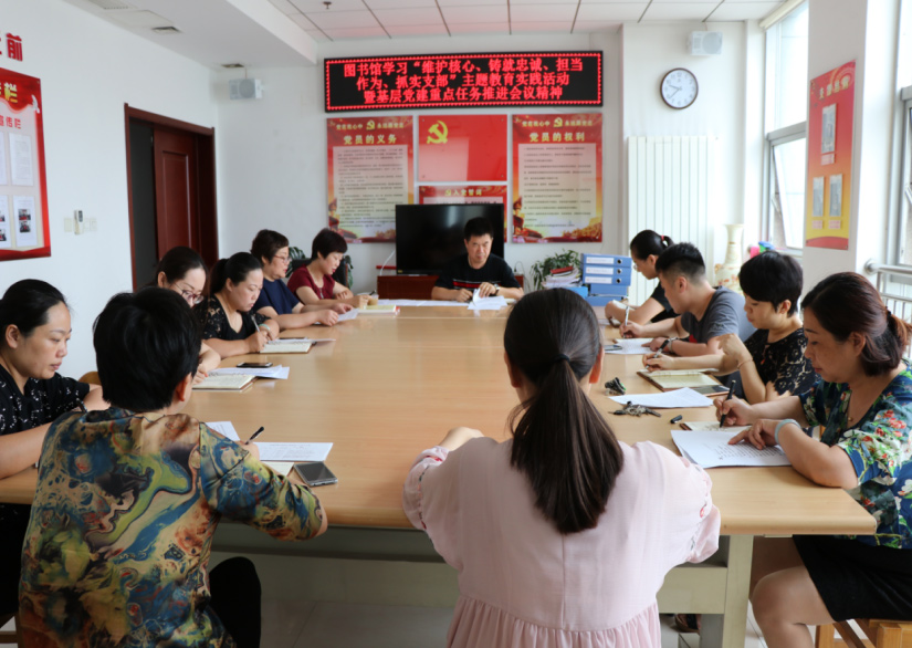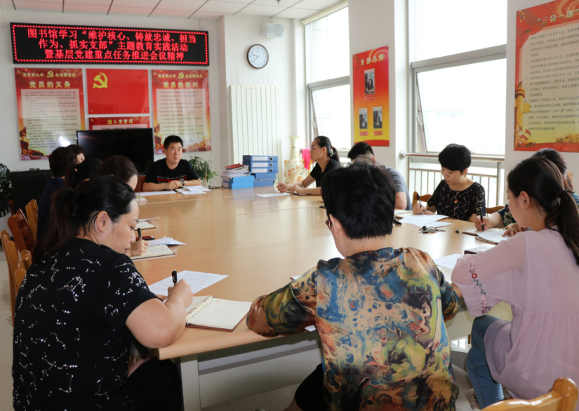 6月29日上午,区图书馆党支部在四楼党员活动室召开全体党员大会,传达学习区委副书记王魁臣同志在深化“维护核心、铸就忠诚、担当作为、抓实支部”主题教育实践活动暨基层党建重点任务推进会上的讲话精神,为进一步深入开展主题教育