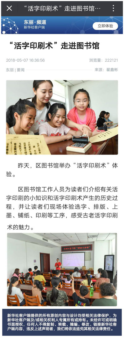 媒体镜头中的东丽区图书馆“书香雅韵”小课堂活字印刷主题活动