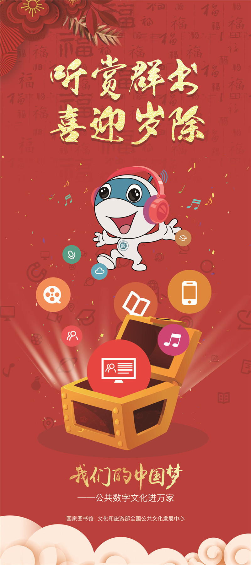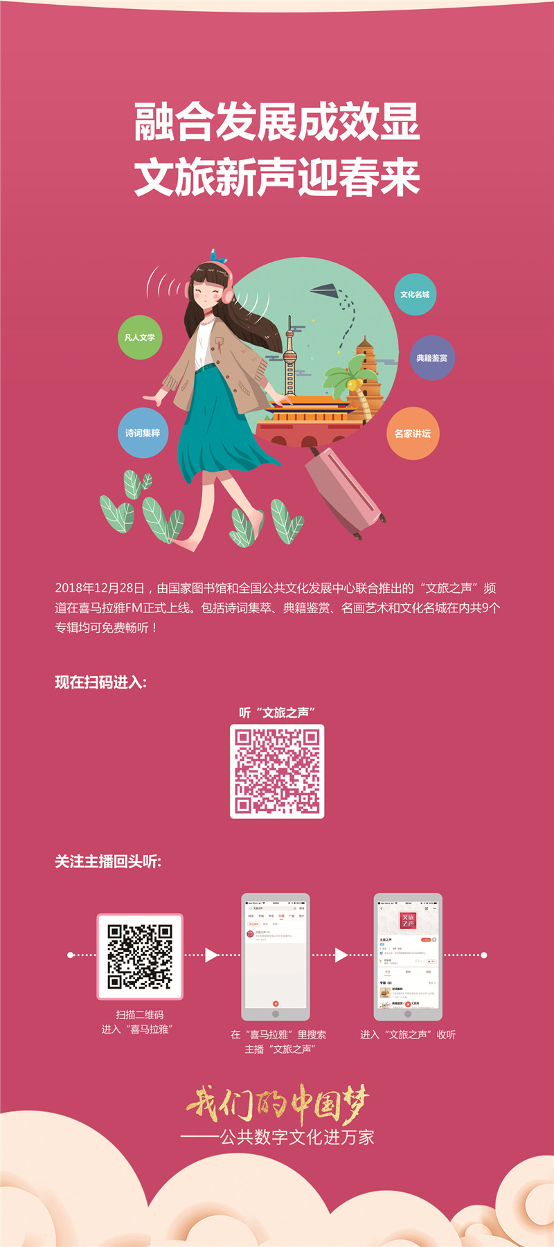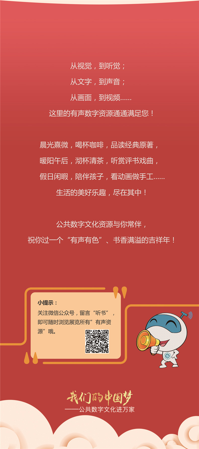 “听赏群书·喜迎岁除”的网上主题展览将挖掘数字图书馆丰富的有声资源,设计兼具知识性与趣味性的主题展览。展览内容包括推广工程资源库群及“移动阅读平台”中戏曲、评书、世界名曲、中外童话、有声书等“听书”资源,同时推介喜马拉雅 FM“文旅之声”频道资源。欢迎大家扫码收听。