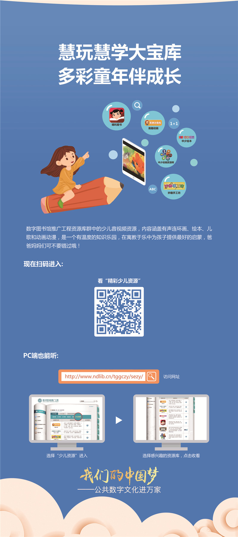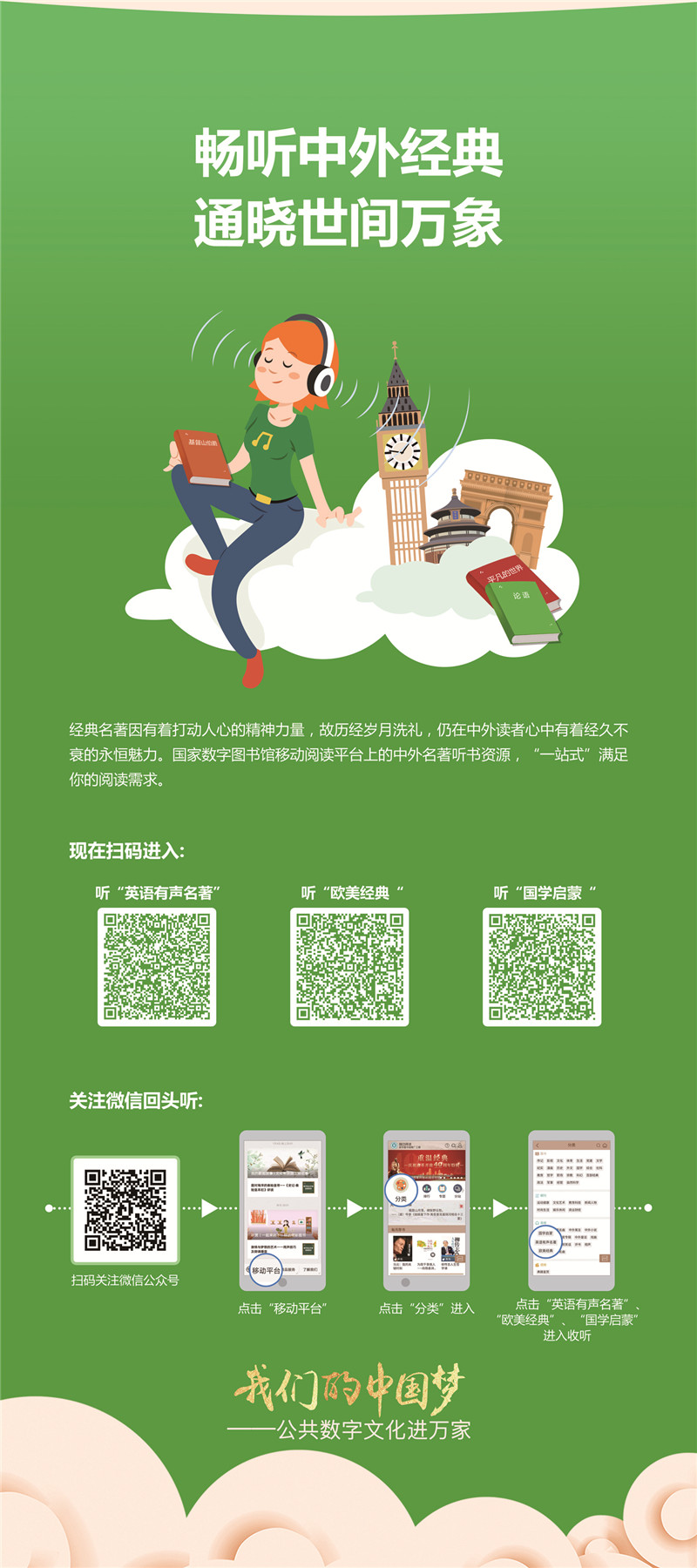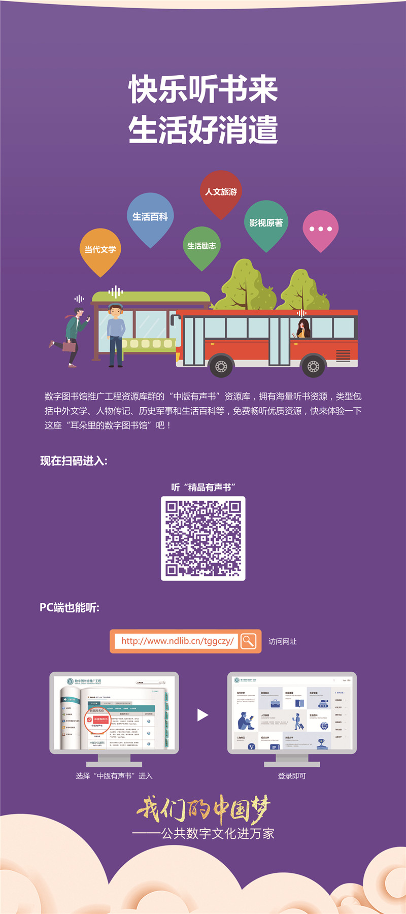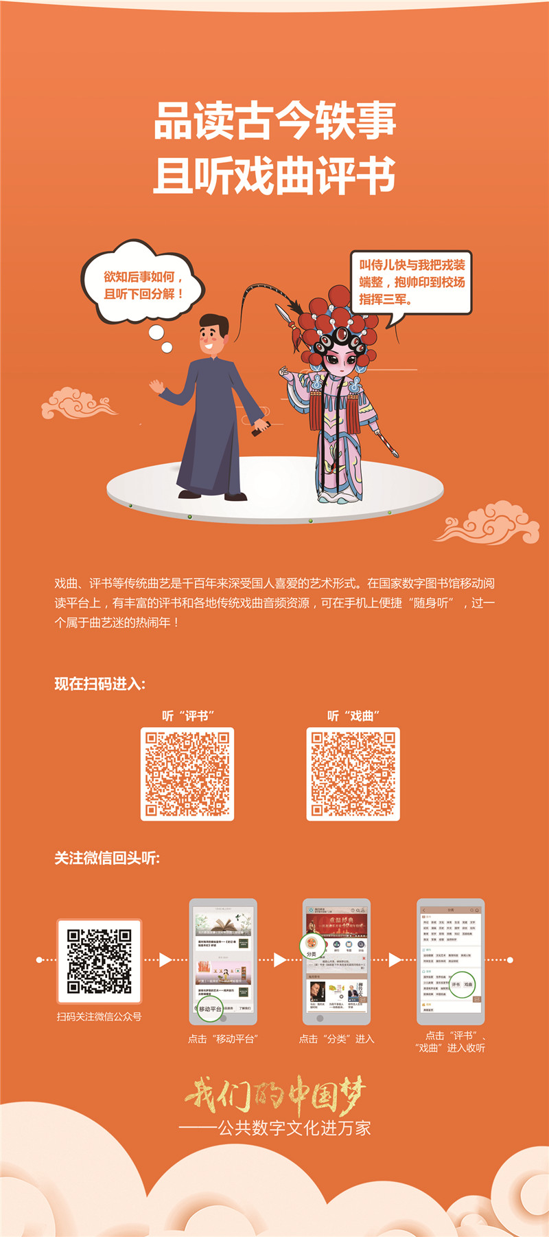 “听赏群书·喜迎岁除”的网上主题展览将挖掘数字图书馆丰富的有声资源,设计兼具知识性与趣味性的主题展览。展览内容包括推广工程资源库群及“移动阅读平台”中戏曲、评书、世界名曲、中外童话、有声书等“听书”资源,同时推介喜马拉雅 FM“文旅之声”频道资源。欢迎大家扫码收听。